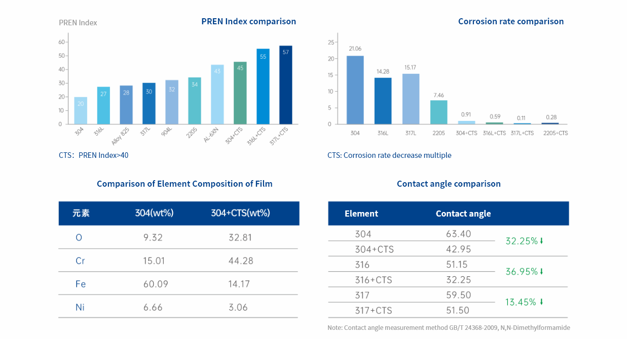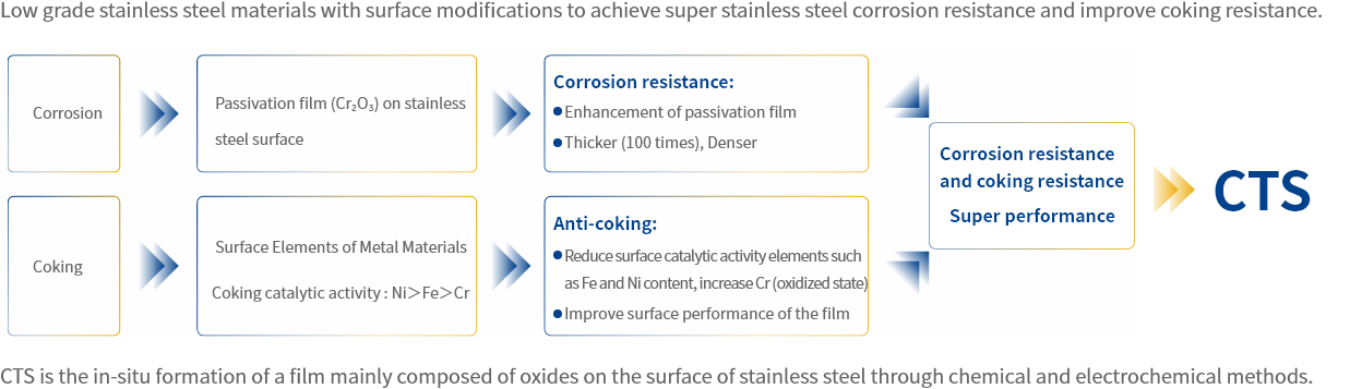 CTS is a surface enhancement technology by in situ surface modifications of stainless steel through chemical-electrochemical methods. It improves the corrosion resistance and anti-coking performance of stainless steel greatly.